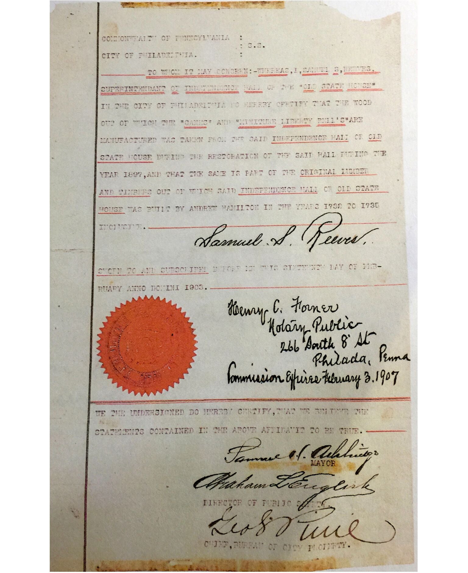- The only documented original construction wood removed from Independence Hall, acquired by the History Salvaged along with documentation dating back to the 1898 restoration and renovation of the Birthplace of America, Independence Hall, Philadelphia, PA.